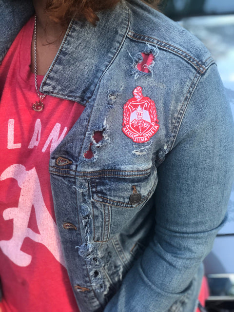 Distressed blue Jean Jacket. All patches are stitched designs. The Jacket is the same design as the picture. There is no add-ons.